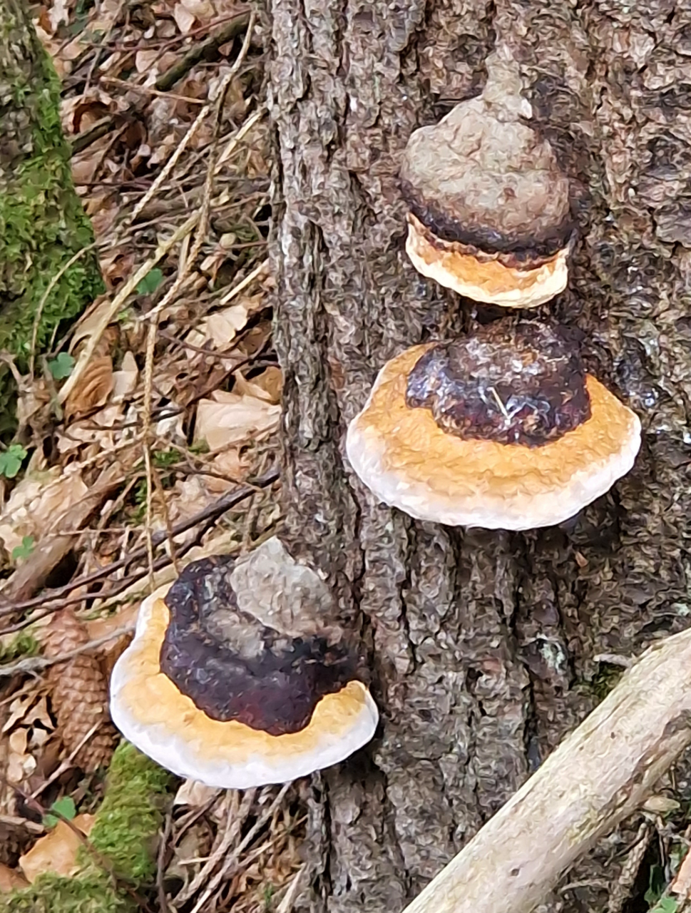Hier sehen wir den rotrandigen Baumschwamm (Fomitopsis pinicola). Er wächst gerne an Nadelholz aber auch an Laubholz und verursacht Braunfäule an dem Baum. Richtig rotrandig ist er selten. Meist hat er eine orangerote Zone und die Zuwachskante ist weiß.